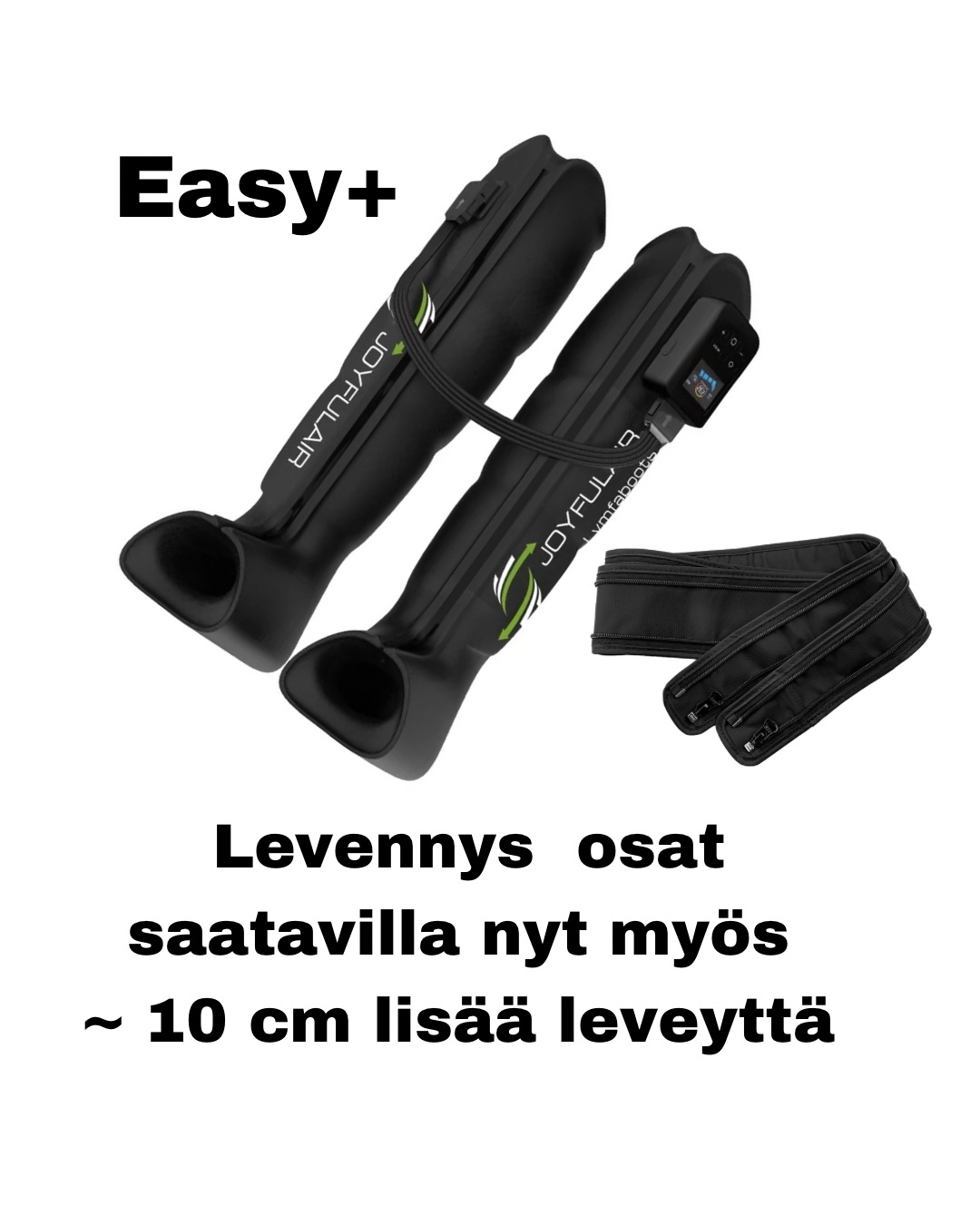Easy+ tarjoaa tuttua laadukasta Joyfulair tehoa ja laatua, vaikka Easy+ onkin ns "kevyempi versio" muihin ammattitason laitteisiimme verrattuna. Et joudu tinkimään silti laadusta, vaikka Easy+ on edullinen. Easy+ On 4 ilmataskukammiota molemmissa lahkeissa, jotka täyttyvät 360 astetta tasaisesti ja turvallisesti Joyfulair tuotteille tunnettuun optiflow tapaan. (Optiflow täyttää lahkeen kammiot lomittain, saumattomasti alhaalta ylöspäin suuntautuvin liikkein, (Optilow -Patent Pending)